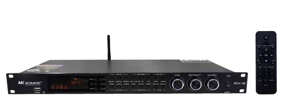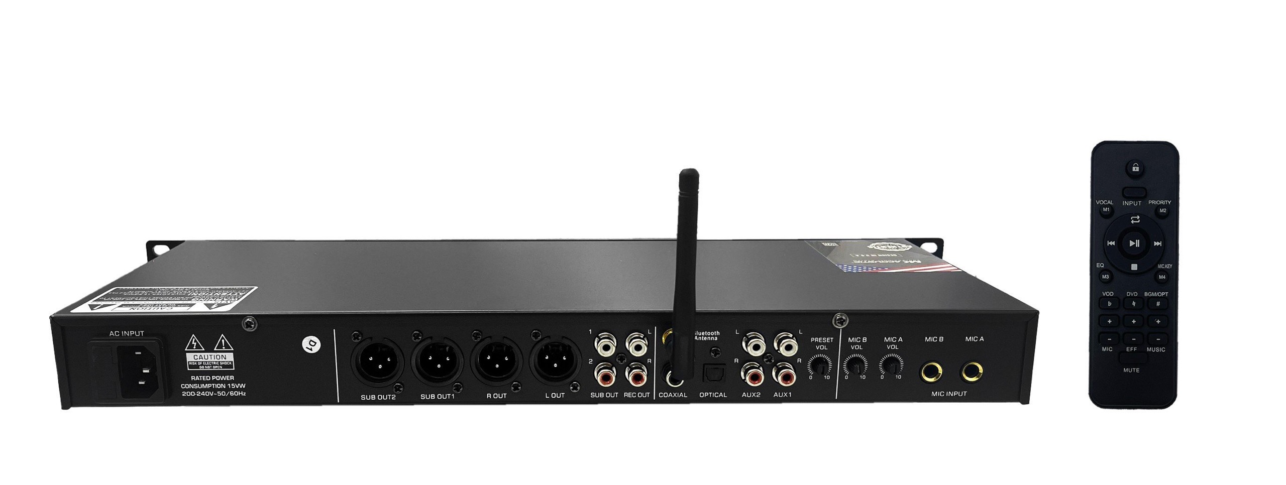 •Mặt trước bao gồm các nút chức năng như nút chỉnh echo, mic tone và âm nhạc cùng các khe cắm míc, đèn tín hiệu kết nối